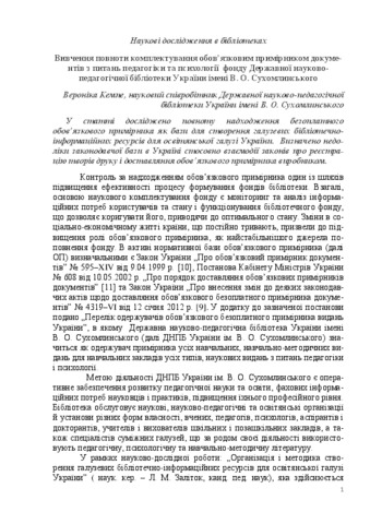 - Кемпе, Вероніка Юріївна (2015) Study completeness acquisition must copy documents on Pedagogy and Psychology Foundation V.O. Sukhomlynskyi State Scientific and Pedagogical Library of Ukraine. Бібліотечний форум: історія, теорія і практика, 2 (2). pp. 2-5.