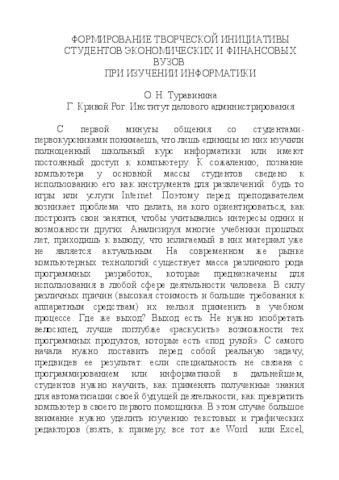 - Туравініна, О.М. (2003) Formation creative initiative of students from economic and financial universities in the study of computer science In: Сучасні технології в науці та освіті (1). Видавничий відділ КДПУ, pp. 42-44.