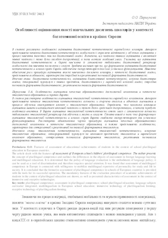 Features of assessment of educational achievements of students in the context of school plurilingual education in European countries. The article deals with the features of assessment of European school children’ plurilingual competence. The author presents the concept of plurilingual competence and outlines the differences in the objects of assessment in foreign language learning and multilingual education. It is determined that the policy of language evaluation is the embodiment of language policy; it can be used as a tool of discrimination and therefore requires special attention. It was found that assessment of multilingual competence in Europe is connected with willingness to mobilize multilingual repertoire of personality for study and life in society. It is concluded that the formative assessment of plurilingual competence in schools of European countries is provided with the tools for its successful operation. The mandatory features of the evaluation procedure of academic achievements of students in the context of plurilingual education are shown, as well as presented characteristics of assessment in the context of immersive and receptive technologies.