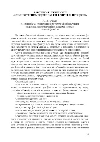 - Єчкало, Ю.В. (2011) The elective course "Computer simulation of physical processes" In: Комп’ютерне моделювання в освіті (4). Видавничий відділ НМетАУ, м. Кривий Ріг, Україна, pp. 17-18.