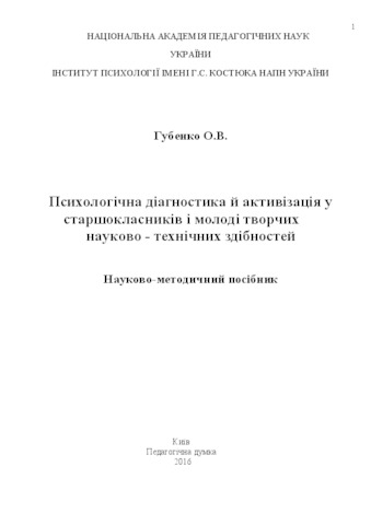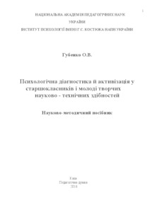 Губенко, О.В. (orcid.org/0000-0002-7197-3913) (2016) Psychological diagnostics and activation of creative scientific and technical abilities at the high school students and young people's . Педагогічна думка, м. Київ, Україна. ISBN 978-966-644-425-0
