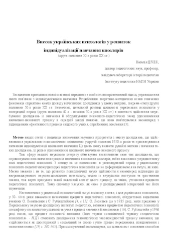 - Дічек, Наталія Петрівна (orcid.org/0000-0002-2185-3630) (2014) Contribution to the development of Ukrainian psychologists individualization of student learning (second half of the 50s of the twentieth century) Native school (11). pp. 57-63. ISSN 0131-6788