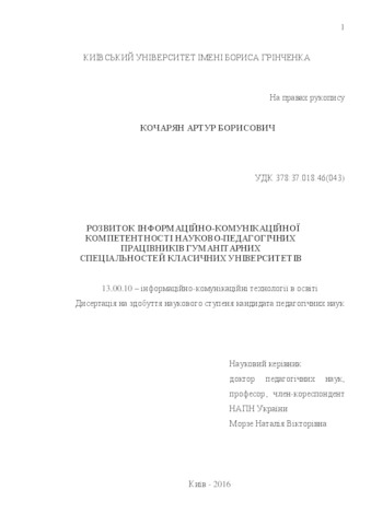 - Кочарян, Артур Борисович (2016) Developing the Information and Communication Competencies of the Humanitarian Faculty’s scientific-pedagogical staff at classicaluniversities Dissertation candidate thesis, Київський університет імені Бориса Грінченка.