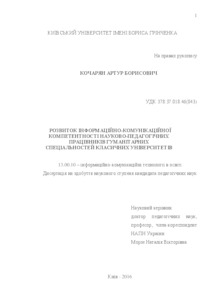 Thesis for degree the Candidate of Pedagogical Sciences, specialty 13.00.10 – Information and Communication Technologies in Education. – Institute of Information Technologies and Learning Tools of NAPS of Ukraine, Kyiv, 2016. Following general theory of the activity structure this study theoretically explained and experimentally tested a model for training the Information and Communication Competencies of the Humanitarian Faculties in three levels: basic, advanced and professional. According to the educator’s activity every IC Competencies level is proposed by appropriate tools. The studied model of developing the Information and Communication Competencies of the Humanitarian Faculty’s academic staff proved its effectiveness. The syllabus for training course “Developing the Information and Communication Competencies of the Humanitarian Faculty’s academic staff” could be also used for a postgraduate training of educators.
