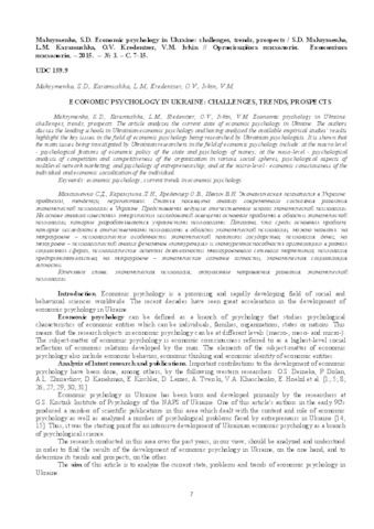 - Максименко, С.Д., Карамушка, Л.М., Креденцер, О.В. and Івкін, В.М. (2015) Еconomic psychology in Ukraine: challenges, trends, prospects Організаційна психологія. Економічна психологія, 3 (4). pp. 7-15. ISSN 2411-3190