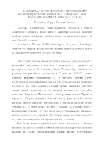 The use of GIS technology in the process of ecological competence of engineers mining structure increases motivation, increases interest in learning activities and ways to acquire knowledge.
