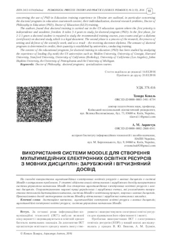 - Коваль, Т.І. and Аврамчук, Антон Миколайович (orcid.org/0000-0002-2868-0541) (2016) Using of the Moodle system for creation multimedia electronic educational resources for language learning: foreign and domestic experience Педагогічний процес: теорія і практика, 2 (53). pp. 93-99. ISSN 2078-1687