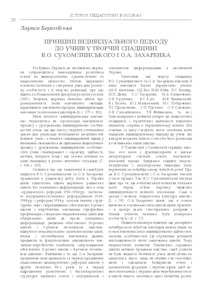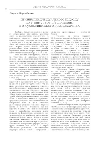 - Березівська, Лариса Дмитрівна (orcid.org/0000-0002-5068-5234) (2010) Principle of individual approach to students in V. O. Sukhomlinsky and O. A. Zakharenko’s creative heritage Історико-педагогічний альманах, 1 (15). pp. 20-26.
