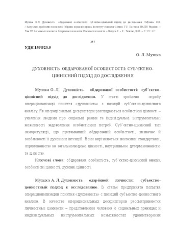 - Музика, О. Л. (2016) Spirituality of a gifted person: subjective-value approach to research Актуальні проблеми психології: Збірник наукових праць Інституту психології імені Г.С. Костюка НАПН України. – Том ІХ: Загальна психологія. Історична психологія. Етнічна психологія, 9. pp. 357-367. ISSN 2072-4772