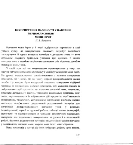 - Бакуліна, Наталія Валеріївна (2008) The use of visual aids in teaching first-graders Hebrew In: Анотовані результати науково-дослідної роботи Інституту педагогіки за 2007 рік . "Педагогічна думка", м. Київ, Україна, pp. 147-148.