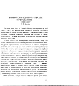 Abstracts reporting conference of the Institute of Pedagogy 2007, section "Language and Literary Education". The report devoted to the use of visual aids in the classroom Hebrew in 1 class schools with Ukrainian language. In zaktsentovano attention to theses functions, types, forms and methods used in the practice of teaching.