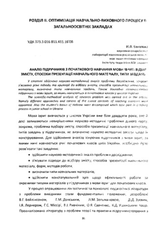 - Бакуліна, Наталія Валеріївна (2009) Analysis of textbooks in primary education Hebrew: selection content, methods of presentation of educational material, types of tasks Педагогічні науки, 2. pp. 86-99. ISSN 978-966-698-136-6