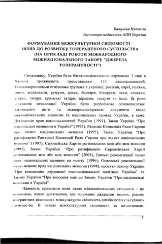 - Бакуліна, Наталія Валеріївна (2007) Formation of intercultural awareness - a way to develop a tolerant society (for example, the work of international international camp "Sources of Tolerance" In: Міжнародна науково-практична конференція, 5-6 жовтня 2007 року, м. Київ, Україна.