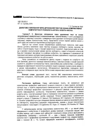 - Гурлєва, Т.С. (orcid.org/0000-0002-6518-5216) (2016) Dialog intercourse through the printed text as a sign of communicative competence of psychologist-author and client-reader Науковий часопис Національного педагогічного університету імені М. П. Драгоманова, 4 (49). pp. 52-58. ISSN 2412-9968