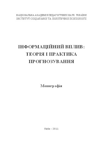 The collective monograph suggests the approach that is focused on the subjective core of Personality, and the logic of constructing a forecast to be defined by the set of messages rather than separate messages. The authors use their own empirical studies for discussing the potential and limitations of the forecasting of consequences of information influence on the human psyche. The body of research can be of interest for a wide range of professionals dealing with theoretical and practical issues of information influence on human mind and behaviour.