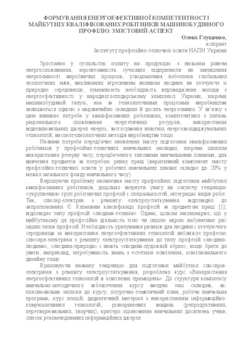 - Глущенко, Олена Вадимівна (2016) Formation of energy-efficient competence of future skilled workers for machine building: content aspect of In: Науково-методичне забезпечення професійної освіти і навчання: матеріали Всеукраїнської науково-практичної конференції (м. Київ, 7, 19 квітня 2016 р.) педагогіка , 1 . Інститут професійно-технічної освіти НАПН України, м.Київ, Україна, pp. 78-80.