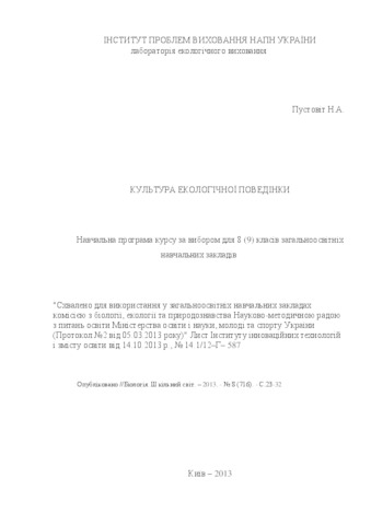 - Пустовіт, Наталія Афанасіївна (2013) "Culture of ecological behaviour". Educational program of elective course for 8 (9) grades of secondary schools [Teaching Resource]