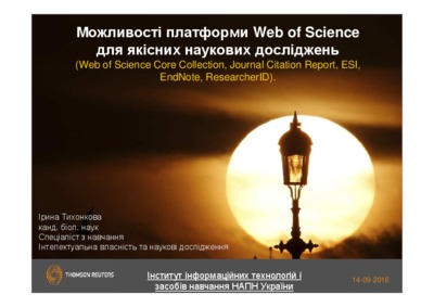 The proceedings of the seminar on the use of international scientometric databases Web of Science, which took place 27.09.2016 year at the Institute of Information Technologies and learning Tools of NAPS of Ukraine. The training seminar was held for the responsible persons from the institutions of the Academy: 1. Opening remarks, opening of the workshop (V.Bykov, Director IITlT of NAPS of Ukraine). 2. Platform Web of Science (Thomson Reuters) for quality of scientific research (Web of Science Core Collection, Journal Citation reports, ESI, EndNote, ResearcherID)(I.Tikhonkova, training specialist Intellectual property and research Thomson Reuters). 3. Master class on the use of the platform Web of Scienc (I.Tikhonkova, training specialist Intellectual property and research Thomson Reuters). 4. Summary of the seminar (O.Spirin, Deputy Director on scientific work IITlT of NAPS of Ukraine).