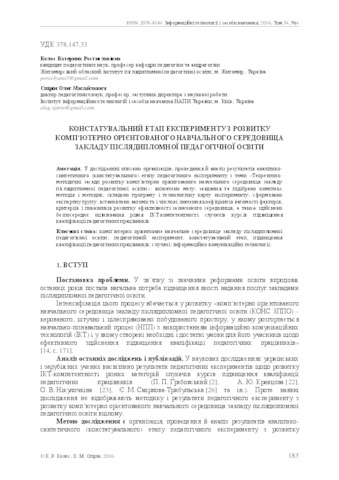 - Колос, К.Р. and Спірін, О.М. (orcid.org/0000-0002-9594-6602) (2016) Constational stage of experiment of computer-oriented learning environment of postgraduate pedagogical education Information Technologies and Learning Tools, 4 (54). pp. 183-205. ISSN 2076-8184