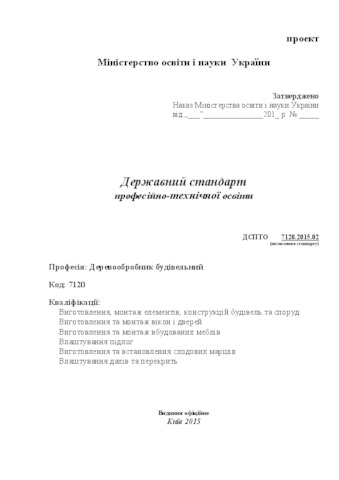 State standard of vocational education from the integrated profession " Building woodworker" is worked out after competence approach taking into account the modern requirements of labour-market and international experience of preparation of skilled workers. It is recommended to the use all vocational educational establishments, enterprises, establishments and organizations that carry (or provide) out preparation (in-plant training) of skilled workers, regardless of their submission and pattern of ownership.