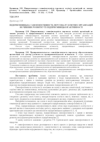 - Креденцер, О.В. (2016) Entrepreneurial self-efficacy of staff of educational organizations as a factor in the development of their entrepreneurial activity Організаційна психологія. Економічна психологія, 1 (4). pp. 51-60. ISSN 2411-3190