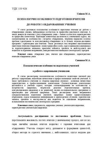 - Сніжна, М.А. (2015) Psychological Features of Training Teachers to Work with Gifted Students Актуальні проблеми психології, 10 (6). pp. 216-223. ISSN 2072-4772