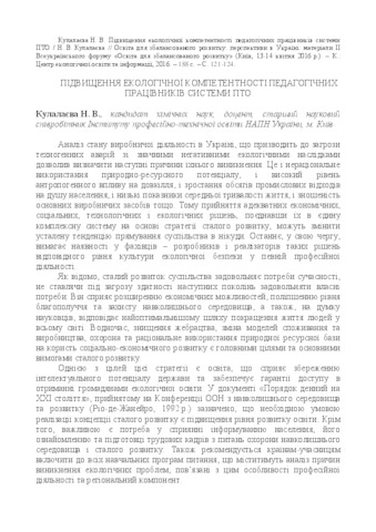 - Кулалаєва, Наталя Валеріївна (2016) Increasing environmental competency teaching staff of vocational education In: Освіта для збалансованого розвитку: перспективи в Україні: матеріали II Всеукраїнського форуму «Освіта для збалансованого розвитку» (Київ, 13-14 квітня 2016 р.) . Центр екологічної освіти та інформації, м. Київ, Україна, pp. 121-124. ISBN 978-617-7130-03-0