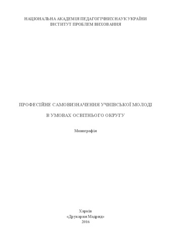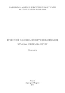 The book reflects the generalized results from the Laboratory of labor education and career guidance technology the Institute of Educational Problems APS of Ukraine on organizational and exploratory stage, experimental work on the topic: "Professional self-determination of studying youth in the conditions of educational district" (2014-2016). We justify the content and pedagogical tools provide professional self-determination of studying youth in the conditions of educational district in the time limit, extracurricular and curricular subject-transformative activities of pre training, specialized education, the work of practical psychologists and social workers, as well as subjects of psychological service in cooperation of the teaching staff and parent community. Materials monograph can be used in the establishment and ongoing activities of resource centers for professional orientation of students of educational districts, development of recommendations for the teaching unions meetings of teachers of natural-mathematical cycle, student leaders, in the preparation of special courses and seminars on general pedagogy, educational work methods in teacher training institutions of different levels of accreditation; to improve the structure of vocational training institutions through the system of postgraduate education.