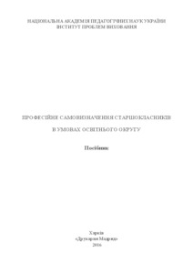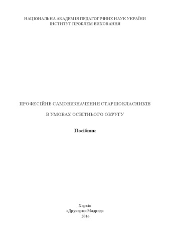 The manual is intended to ensure the implementation in practice of the educational content of the educational districts of modern forms and methods of formation of professional self-determination of senior pupils. The implementation of the content of benefits will create favorable conditions for targeted joint activities of subjects of voluntary associations, educational, social, cultural and community organizations in order to enhance the process of professional self-development with the dynamic requirements of the modern labor market. Applying the findings of the present study, experts and resource centers of vocational guidance, school psychologists, social teachers, subject teachers, homeroom teachers will be able to provide quality training of senior secondary schools for professional self-determination. It is expected that the introduction of material benefits to career-oriented activity of subjects of educational districts requires personal, essentially man-centered, approach to the professional orientation of students.