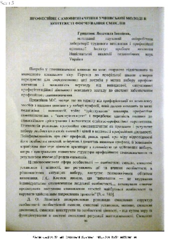 - Гриценок, Л.І. (2014) Professional self-determination of students in the formation context of meaning In: Актуальні проблеми психології обдарованості та творчості: новітні розробки українських вчених: матеріали Міжнародної наукової конференції . Інститут обдарованої дитини, м. Київ, Україна, pp. 96-98.