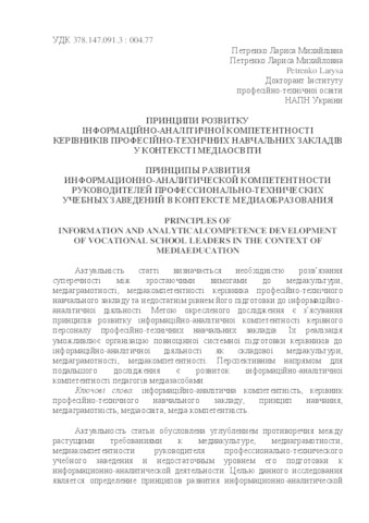 - Петренко, Лариса Михайлівна (2013) Principles of information and analyticalcompetence development of vocational school leaders in the context of mediaeducation «Медіаосвіта в Україні: наукова рефлексія викликів, практик, перспектив. pp. 584-595.