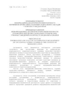 The article outlines the importance of the problem that has been conditioned by deepening of contradiction between growing requirements to vocational school leaders' mediaculture, medialiteracy, mediacompetence and insufficient level of their information and analytical training. The aim of this research is to determine the principles of development of information and analytical competence of the vocational school managing staff. Their implementation will give an opportunity to develop a system of complete information and analytical training of leaders to enable their relevant activity as an integral part of their mediaculture, medialiteracy, mediacompetence. Teachers' information and analytical competence development by means of mediafacilities can be viewed as a perspective for further research.