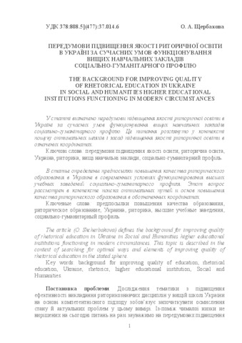 Text (Стаття Олени Щербакової "Передумови підвищення якості риторичної освіти в Україні за сучасних умов функціонування вищих навчальних закладів соціально-гуманітарного профілю" у теорет. та наук.-метод. часописі "Вища освіта України" (Київ, 2013))