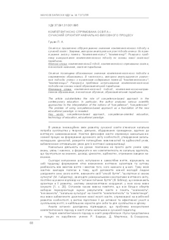 - Гуцан, Л.А. (2014) A competency aimed education - modern landmark educational process Наукові записки [Ніжинського державного університету ім. Миколи Гоголя]. Психолого-педагогічні науки, 2. pp. 68-72.