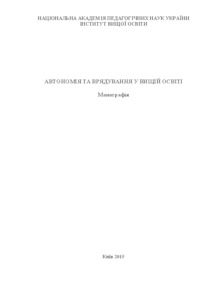 The book "Autonomy and Governance in Higher Education" was prepared for the results of the research work on the same theme in the department of politics and governance in higher education at the Institute of Higher Education NAPS of Ukraine. Before the research team task was to develop and justify implementing relevant model of autonomy and governance in higher education in Ukraine based on international experience and historical discourse. Summary results of the study. The book will be useful for job seekers, teachers, researchers, managers of higher education and all natural and legal persons interested in it its development.