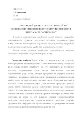 - Бородієнко, О.В. (2016) Foreign experience in professional competence development of communication companies' heads of departments Науковий вісник Миколаївського національного університету імені В.О.Сухомлинського. Педагогічні науки, 3 (54). pp. 280-286. ISSN 2518-7813