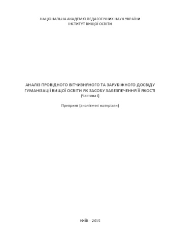 Preprint (analyzes) "Analysis of the leading domestic and foreign experience of humanization of higher education as a means of ensuring its quality" is a result of the first phase of research on "Ideological priorities humanization of higher education" in the department of higher education quality at the Institute of Higher Education NAPS Ukraine. At this stage, the research team of investigators to the task was to identify and describe existing approaches to the development of quality higher education. The publication will be useful for job seekers, teachers, researchers, managers of higher education and all natural and legal persons interested in its development.