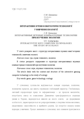 - Грищенко, С.М. (2012) Іnteraktivnye sony computer technologies the study of ecology Педагогіка вищої та середньої школи, 35. pp. 170-179. ISSN 2304-4470