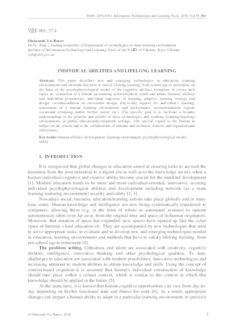 - Буров, О.Ю. (2016) Individual Abilities and Lifelong Learning Інформаційні технології і засоби навчання, 5 (55). pp. 1-11. ISSN 2076-8184