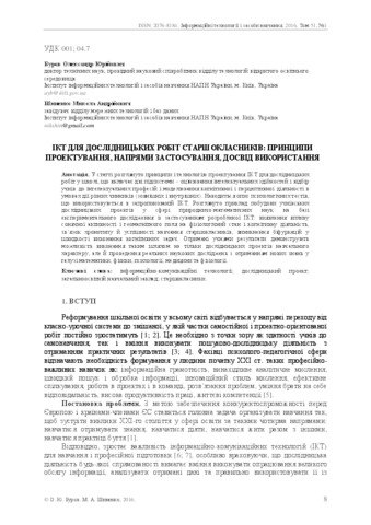 - Буров, О.Ю. and Шиненко, М.А. (2016) ICT research for high school students: design principles, trends and experience of use Інформаційні технології і засоби навчання, 1 (51). pp. 8-20. ISSN 2076-8184