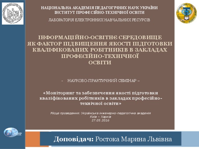 - Ростока, Марина Львівна (2016) Informational and Educational Environment as a Factor in Improving the Quality of Training of Qualified Workers in the Institutions of Vocational Education In: Науково-практичний семінар "Моніторинг та забезпечення якості підготовки кваліфікованих робітників в закладах професійно-технічної освіти", 27 травня 2016 року, м. Харків-Київ, Україна.