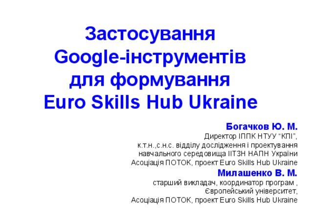 Богачков Застосування Google-інструментів для формування Skills Hub - ПРЕЗЕНТАЦІЯ на GEG 9.02.2016 ПОТОК.pdf Download (1MB) | Preview |