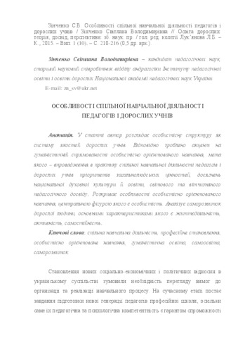 - Зінченко, Світлана Володимирівна (2015) Features of joint training activities of teachers and adults students Освіта дорослих: теорія, досвід, перспективи, 1 (10). pp. 210-216. ISSN 2308-6386