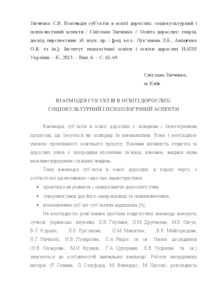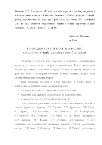 - Зінченко, Світлана Володимирівна (2013) Between subjects in adult education: socio-cultural and psychological aspects Освіта дорослих: теорія, досвід, перспективи, 6. pp. 61-69. ISSN 2308-6386