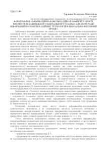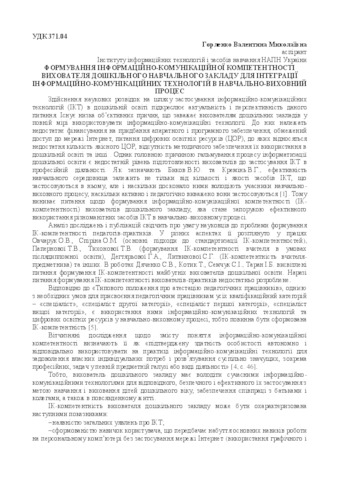 - Горленко, В.М. (2015) Formation of Information and Communication Competence kindergarten teacher to integrate ICT in the educational process In: Збірник матеріалів ІІІ Всеукраїнської науково-практичної конференції молодих учених "Наукова молодь-2015" . Інститут інформаційних технологій і засобів навчання НАПН України, м.Київ, Україна, pp. 20-21.
