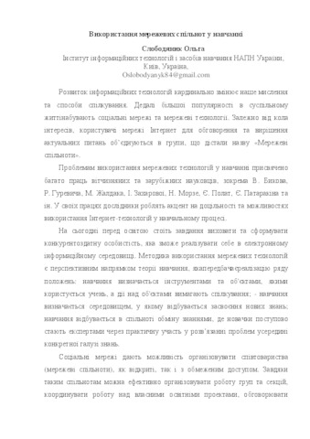 - Слободяник, О.В. (2016) The use of online communities in education In: Матеріали Міжнародної науково-практичної конференції [“Актуальні проблеми природничо-математичної освіти в середній і вищій школі”] . Видавництво ХНТУ, м. Херсон, Україна, pp. 100-102.