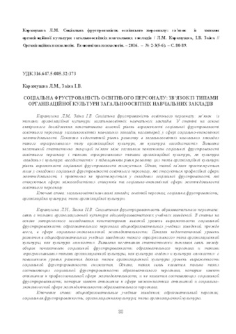 - Карамушка, Л.М. and Заіка, І.В. (2016) Social frustration of teaching staff: relationship with the organizational culture types of secondary schools Організаційна психологія. Економічна психологія, 2-3 (5-6). pp. 80-89. ISSN 2411–3190