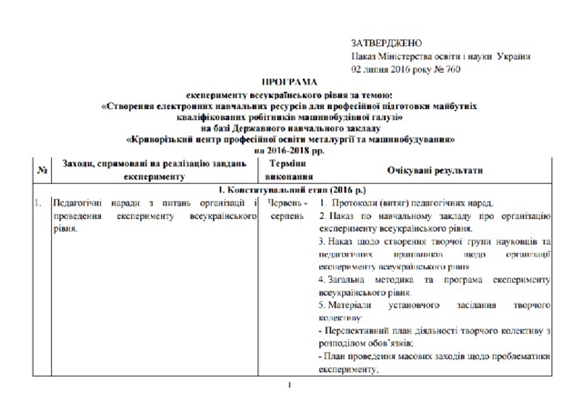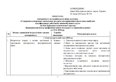 - Ростока, Марина Львівна, Упиренко, Аліна Володимирівна and Онопрієнко, Людмила Михайлівна (2016) Ukrainian level experimental program on the topic "Creation of electronic learning of resources for training qualified of workers in the vocational schools of engineering industry" [Experiment]