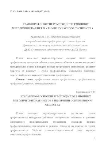 - Кравчинська, Т.С. (2016) Тhe stages of profesiogenez of methodists of district methodical cabinets in measuring of modern society Педагогічні науки, 70 (2). pp. 66-69.
