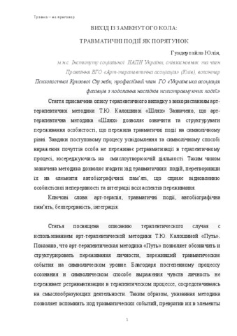 - Гундертайло, Юлія Данилівна (orcid.org/0000-0001-6959-663X) (2016) Exit from a vicious circle: traumatic events like salvation Простір арт-терапії, 1 (19). pp. 69 -80.